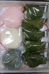 本来は、あん入りの赤・白・緑(よもぎ)の大きいおまんじゅうを5個入れたものが主流でしたが、近年は柏もちや、ちまきなどと組み合わせる方も増えています。