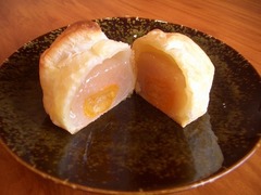 きんかんの蜜漬けを、白あんでくるみお餅で包んでパイで焼き上げました。