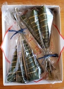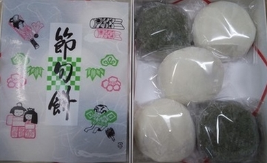 本来は、あん入りの赤・白・緑(よもぎ)の大きいおまんじゅうを5個入れたものが主流でしたが、近年は柏もちや、ちまきなどと組み合わせる方も増えています。